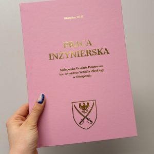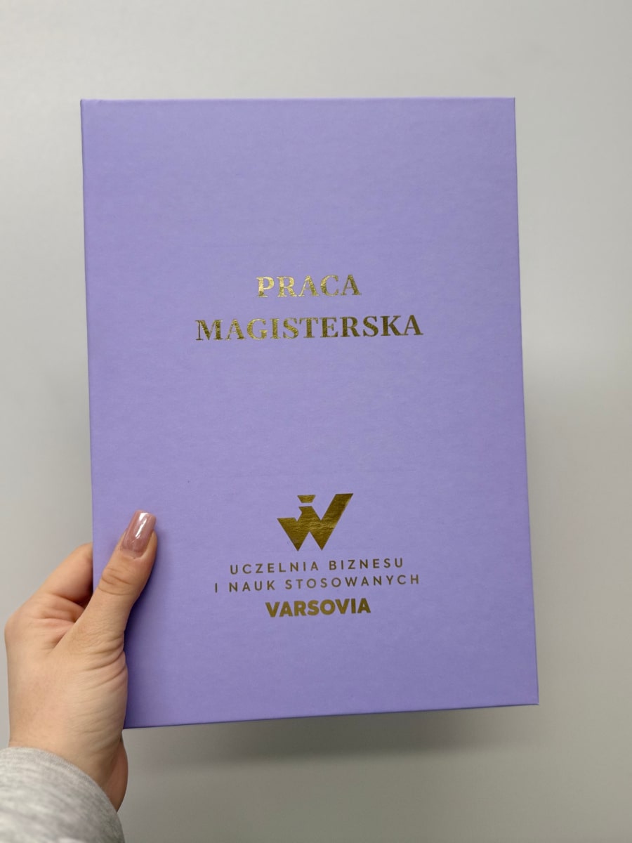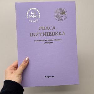 Specyfikacja Wybór oprawy: twarda oprawa z wydrukiem Twojej pracy dyplomowej lub sama okładka (bez wydruku). Wytłoczony napis na okładkę: PRACA MAGISTERSKA (lub dowolny inny). Kolor napisu: złoty, srebrny, czarny, biały lub holograficzny. Kolor okładki: dowolny spośród 30 kolorów. Personalizacja: dodanie logo uczelni, imienia lub unikalnego projektu w naszym kreatorze okładek! ???? (sprawdź szczegóły) Format okładki: A4 […]